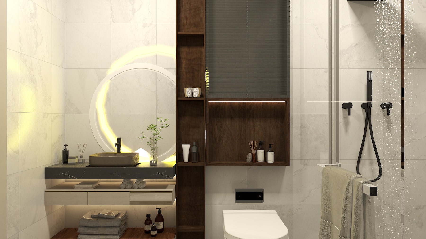 - Build-in waterproof open shelf in full color plywood